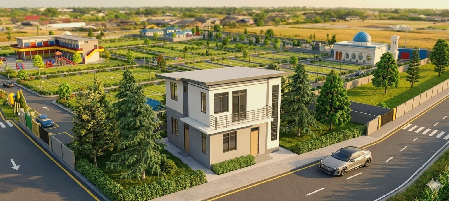 Premium touches include quality tile flooring, painted and finished walls, aluminum-framed windows, and a well-appointed kitchen with provisions for modern appliances. The clean-lined facade features contemporary Islamic-inspired design elements.